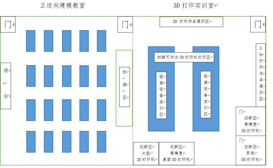 根據(jù)校方要求,我們了解到3D打印實訓室總規(guī)劃面積為200 m2。根據(jù)實訓室的用途,需要采購的設(shè)備,可分為五大區(qū)域: